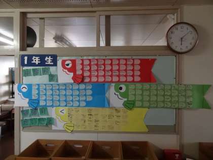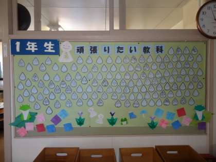 学年掲示板が鯉のぼりから、6月の梅雨バージョンに変更されました。