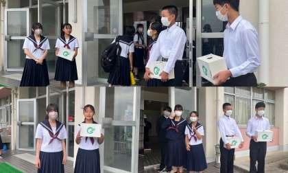 福祉委員が朝早くに集まり、登校する生徒に呼びかけをしました。