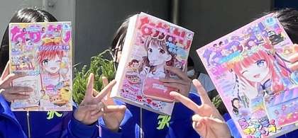 回収まんが雑誌「なかよし」を手に写真をパチリ