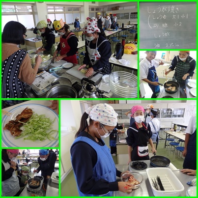 15日(木)の2時間目にきゃべつの千切りの実技テストと,しょうが焼きを作りました。しょうが焼きのお肉が1人2枚ということもあってか,みんな焦げないように慎重に焼いていました。千切りきゃべつの横にしょうが焼きを置いて完成。会食では,「おいしい」という言葉が,たくさん聞こえてきて,みんな上手に調理できたようです。