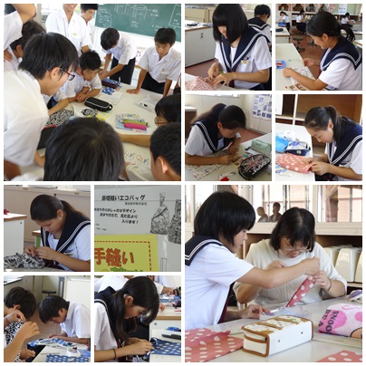 家庭科の授業では、手縫いでエコバッグを作っています。