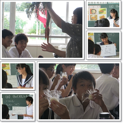 栄養教諭の準備した小さな包みを手に取ると「あっ、これ、守口大根のにおい!」と敏感に生徒達は反応し、嬉しそうに、「食べていいの?」と守口漬けとにんじんの炊き込みご飯の試食。次に、家庭科教諭が、朝取りの土のついた本物のニンジンを紹介すると、生徒達の顔がほころび、笑顔がこぼれました!