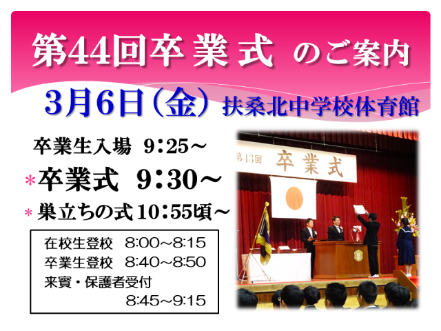 日 時:令和8年3月6日(金)午前9時30分 開式☆来賓・3年生保護者受付 8時45分〜9時15分