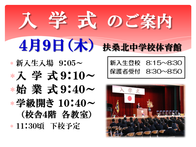 日 時:令和8年3月6日(金)午前9時30分 開式☆来賓・3年生保護者受付 8時45分〜9時15分