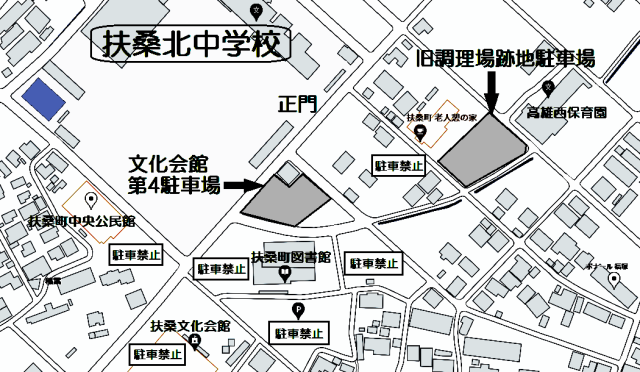 ・自家用車で来校される方は,上の地図のように文化会館第4駐車場と旧調理場跡地駐車場をご利用ください。なお,駐車台数に限りがありますので,できる限りご近所等で乗り合わせていただくか,自転車や徒歩での来校にご協力ください。上記以外の場所には,くれぐれも駐車されないようお願いします。