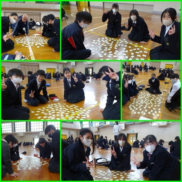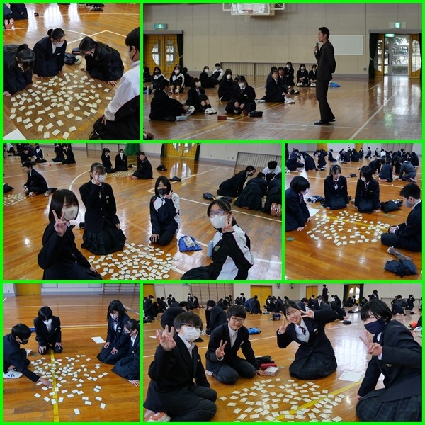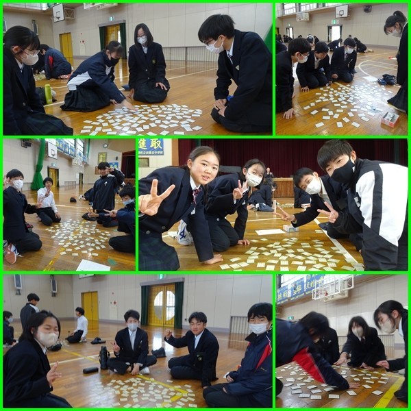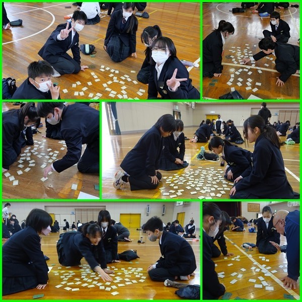 今日の1時間目に体育館で、百人一首大会をやりました。これまで国語の時間を使って、何回か練習を重ねてきました。最初は、上の句だけで取ることができなかった子も、今日の本番では上の句で取れるようになっていました。大変盛り上がってとても良い雰囲気でしたね。どのクラスが優勝なのかはお楽しみに!