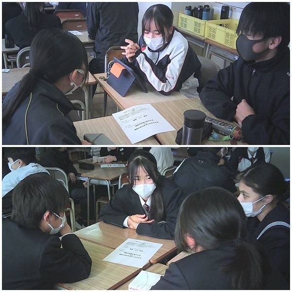 将来役に立つと思うのは・・・「国語or数学」、生まれ変わるなら・・・「理想の性格に変われるor理想の学力を手に入れられる」という二者択一の問題を2問、班に分かれて取り組みました。前回の北チュータイムで学んだ、相手と自分の意見の両方を大切にして答えるアサーティブコミュニケーションを心掛けるということでした。アサーティブコミュニケーションを心掛けた会話ができましたか?このような話し方ができるようになると、相手とよりよい交友関係を築けるだけでなく、自分自身の視野を広げることができ、物事をより深く考えることができるようになると思います。日ごろから心掛けられるといいですね。