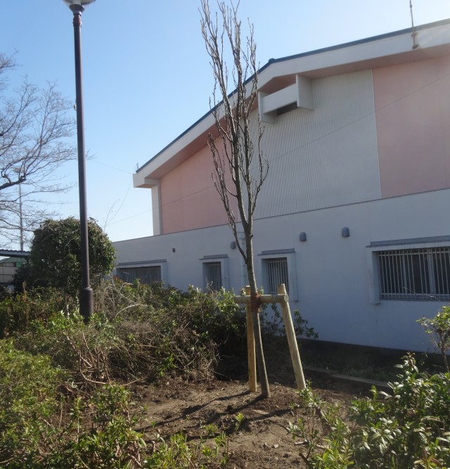 2年前に寿命により、やむなく伐採した山名門のサクラ(ソメイヨシノ)の跡地に、本日、新たにサクラを植樹しました。品種名は「アマノガワ(天の川)」です。八重咲きで、まっすぐ成長していく品種です。一般的なサクラであるソメイヨシノとは異なり、花と同時に葉も出てきます。(ソメイヨシノは、花が散った後に葉が出てきます。)また、開花時期は4月中旬頃です。入学式や始業式の頃に咲いてくれるとよいなと思います。