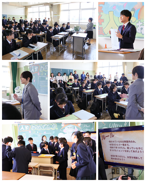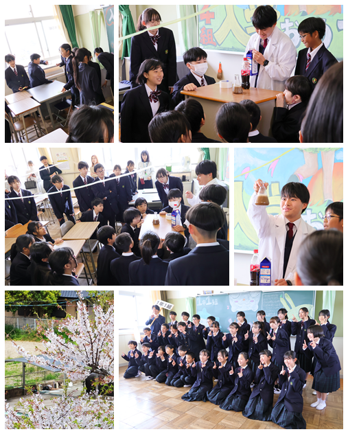 各教室で、学級開きを行いました。担任の自己紹介や謎解き、理科の実験、学級写真など、各担任が工夫をして新入生を迎えました。