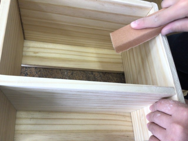 技術の授業では、木材の作品を製作しています。組み立てをしてから手ざわりが良くなるように、一生懸命やすりで磨いていました。