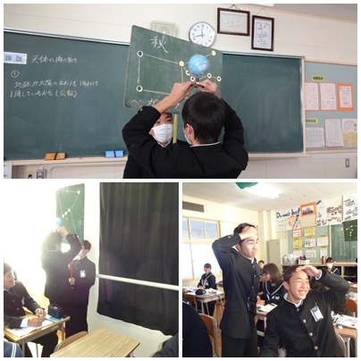 理科では,地球の公転と自転によって,見える星座がどのように変わるのかを調べました。生徒に太陽役,地球役,さそり座役,ペガスス座役,オリオン座役,しし座役をやってもらい,太陽と地球と星座との位置関係で見える星座と方角が変化することを確認しました。この単元は,なかなか目で確認することが難しいので,イメージすることが大切です。しっかりとイメージをつかめたでしょうか。