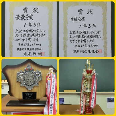 1年3組のみなさん,合唱コンクール最優秀賞おめでとう。同時に生徒会賞も受賞し,喜びもひとしおですね。