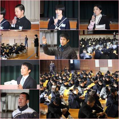 生徒指導の先生から、ネットトラブルに巻き込まれないこと、触法行為を起こさないこと、夜の外出はしないことなど、年末年始に多発する事故や事件に巻き込まれないように、自分の身は自分で守る意識をもつようにというお話がありました。