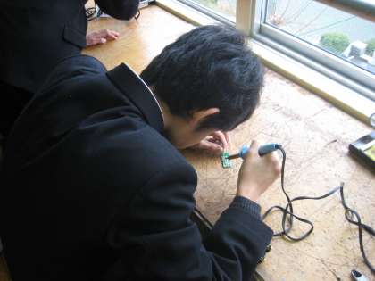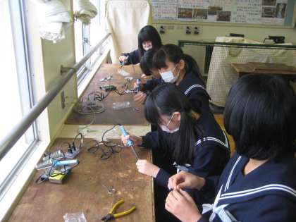 現在,2年生の技術科授業では「人感センサーライト」の製作に向けて学習を進めています。そこで,今日は今後の基盤作成に向けて,はんだ付けの練習をしていました。前時においても練習をしていたとのことで,手際よく作業を進めることができる生徒もいました。