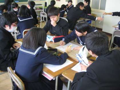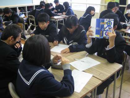 本日5時間目の総合の時間に東京の地名や施設名,路線図を確認しました。東京は名古屋市内の路線図と比べとても複雑です。生徒は,舞浜駅から指定された場所まで行く方法を,ガイドマップを利用して最寄駅を調べながら考えました。上級学校訪問で名古屋市内の路線図を利用していることもあって,以前よりも素早く目的地までの行き方を調べることができました。