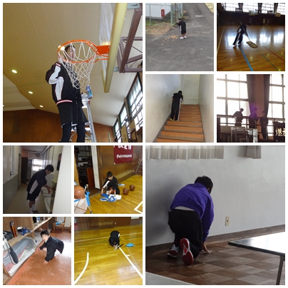 今日は,部活動納めでした。男子バスケ部は,午前中に通常練習を行いました。途中,校長先生も来て,五対五を行いました。午後からは,体育館の大掃除を行いました。窓の桟やバスケットボードや体育倉庫などさまざま場所を2時間半かけて掃除しました。とてもきれいになりました。気持ちよく新年の部活を迎えられそうそうです。