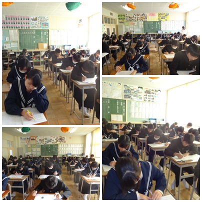 3年生は,大切な後期期末テストを受けています。みんな一生懸命勉強してきた様子が見られます。最終日は,月曜日です。土日でしっかりと準備を整えて臨みましょう。くれぐれも病には気をつけましょう。