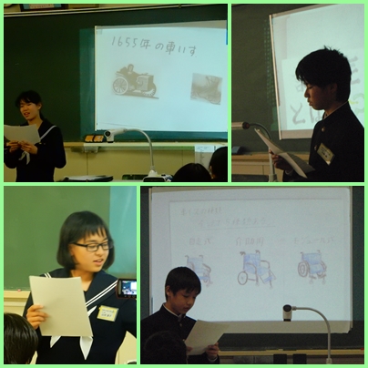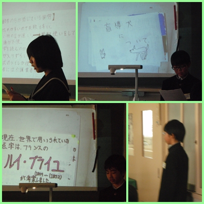1年生の本日の6時間目は研究内容の発表でした。各自が冬休みの間に研究した福祉の1分野を、スクリーンを使いながらプレゼンしていきました。