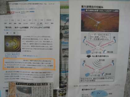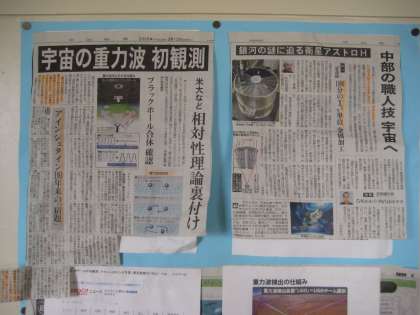 理科の先生のクラス前には,理科にまつわるトピックスが紹介されています。現在は,アインシュタインの最後の宿題と言われる「重力波」が初観測されたニュースが紹介されています。多くの情報を紹介することで,話を聞くだけではなかなか理解しにくいことも少しは興味を持つことができるようにとの願いを込めて,工夫された紙面づくりがされています。