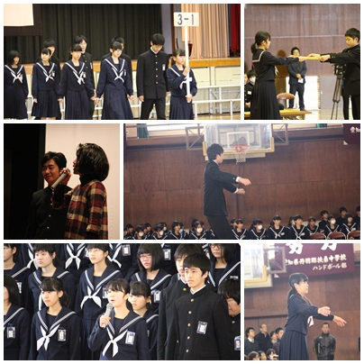 先生からの出し物では,保健集会で劇を行った滝ママと俊ちゃんのやりとりから思い出を振り返り,修学旅行で感動的だったレ・ミゼラブルの「民衆の歌」を職員全員でミュージカル風に歌いました。その後,3年生からサプライズでお礼の手紙をいただきました(ノд-、)クスン