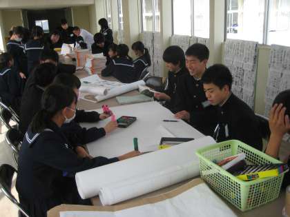 修学旅行に向けて,2日目の夜の実行委員は活動をはじめています。修学旅行の2日目の夜は,実行委員によるお楽しみ企画を行い,その後,戦場カメラマンの渡部陽一さんに講演会をしていただく予定です。現在実行委員は,「お楽しみ企画班」「渡部陽一さん集会班」「掲示班」の3つのグループに分かれて,放課に自主的に集まって準備を進めています。楽しく学べる修学旅行にするために,「みんなで」作りあげていきましょう。