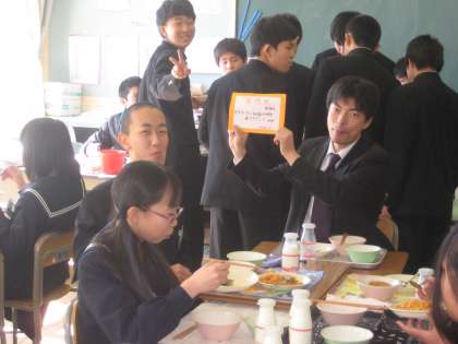 いつもの給食の時間とは一味違う雰囲気の中,5組の生徒たちはさまざまな反応を示しながら楽しんでいました。特に,バスケットボール部男子の生徒たちは何だか緊張しながら食事をしているようでした。