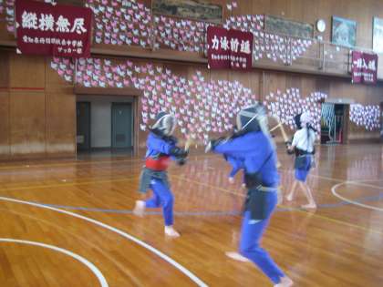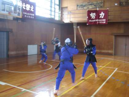 これまでの授業を通して,防具の着脱が素早くできるようになり,さまざまな技を繰り返し練習してきました。それらを生かして,今日は短い時間ながら試合形式の練習を行いました。