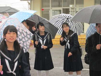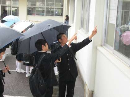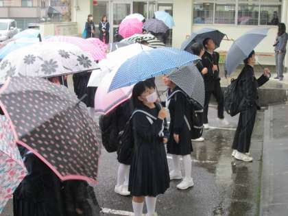 朝、渡り廊下の外側に新しいクラスが張り出されました。あいにくの雨の中、生徒たちは一年の期待と不安を胸に自分のクラスを確認していました。新しい出会いを大切に、お互いを助け合えるような人間関係を築いていきましょう。