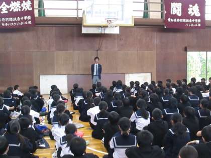 6限集会後,学年集会を行いました。しっかりと課題を行うこと,明日から部活動の仮入部があることの確認,苦しいことから楽することに逃げるのではなく,耐えて頑張ることを話してくださいました。また,校長先生からは挨拶が良いこと,伊藤先生からは集会の態度が良かったことをほめられました。これからもこの調子で中学校生活を送りましょう。