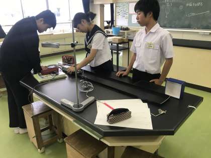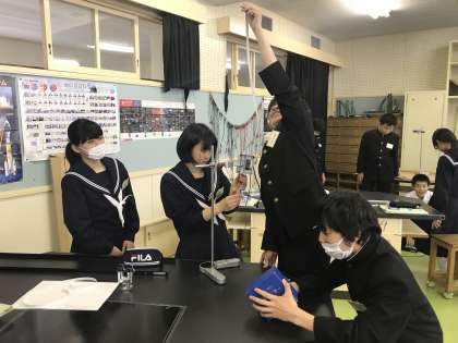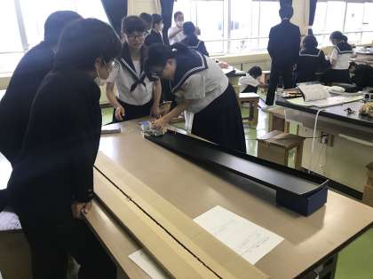 1組の理科の授業では前回の斜面を下る運動に続き、斜面を上る運動、落ちる運動、水平な面での運動を実験しました。実験の結果から次回は考察をします。