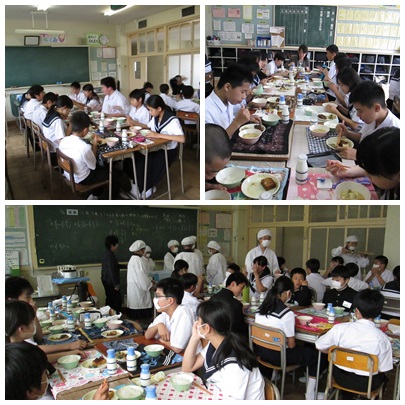 今日の給食の様子です。中学校に入学してから約1か月が経ちました。中学校生活にも慣れてきて,給食の準備も自分たちで行うことができるようになってきました。そして,クラスメートと会話をしながら,楽しく食べていました。