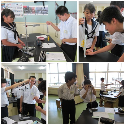 理科の授業では,滑車と仕事の実験を行いました。みんな真剣です。