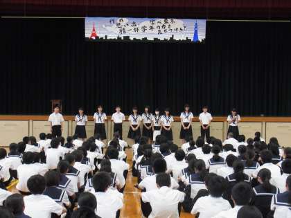 金曜日に体育館で出発式を行いました。忘れ物がないか確認をした後、荷物をトラックに積み込みました。その後今まで修学旅行に向けて中心となって準備行ってきた生徒の話、校長先生、学年主任の先生の話を聞きました。月曜日から3日間修学旅行に出かけます。準備はバッチリです。「作れ思い出 学べ東京 精一杯学年の力をみせつけろ!」のスローガンを達成することができるように、精一杯学年全員で成功に向けて頑張ります!!