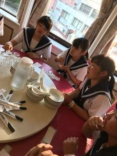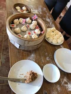 肉まん作り体験をしました。つまむのがむずかしいと曽我先生。蒸してもらってます。