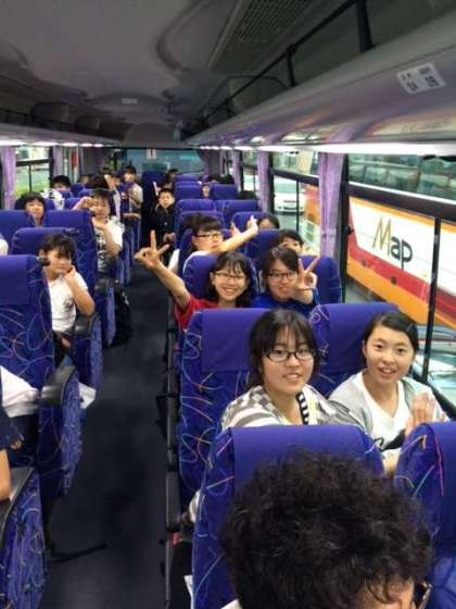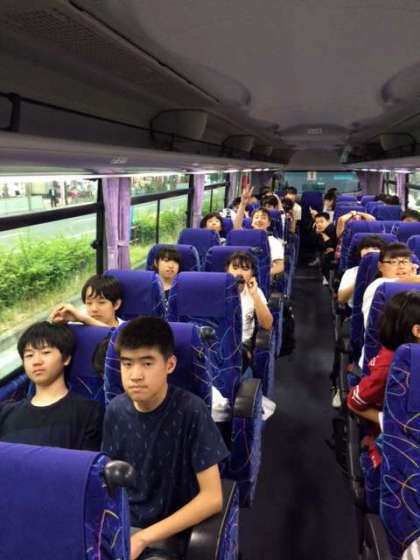 名古屋駅太閤通りにて、バスに乗りました。あと45分ぐらいで学校に到着すると思います。まだまだみんな大変元気です。