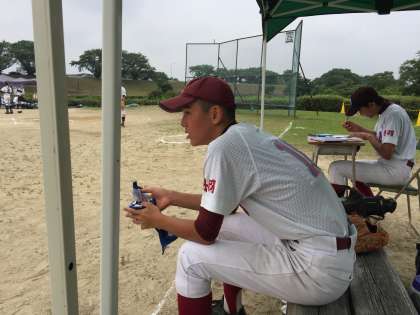 本日、野球部は犬山緑地グランドにて二回戦目を行います。9時より犬山中学校と戦います。アップ中です。監督も真剣です。本日もよろしくお願いします。