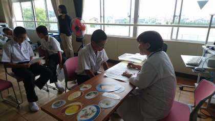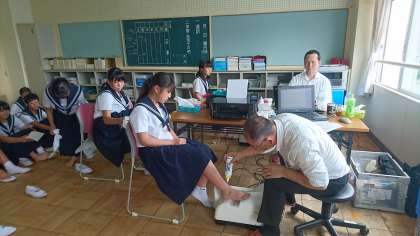 学校給食牛乳協会等にご協力いただいて、2年生対象に骨密度測定を行いました。日常のアンケートと骨密度の結果を見ながら、管理栄養士から一人一人指導をうけました。