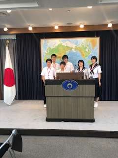 防衛省へ訪問したグループは、防衛省の組織や役割について学びました。マイクやスクリーンが高機能な会議室や実際にニュースなどで流れる記者会見の部屋に連れて行ってもらい、生徒たちは感動していました。
