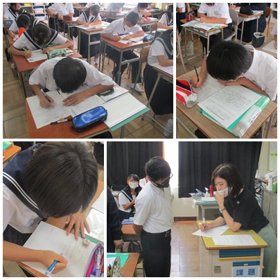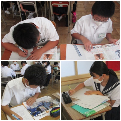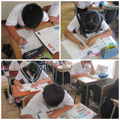 学習のまとめをしています。黙々と一生懸命に作成する姿、周りの友達レポートと見比べよりよい作品にしようという姿などが見られました。