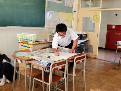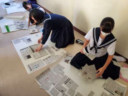 5、6時間目を使い、新聞切り抜き作品の作成をしています。模造紙にどのように記事を貼りつけるか、どんな意見を書き込むのか、レイアウトをしっかり考えて、作業を進めています。