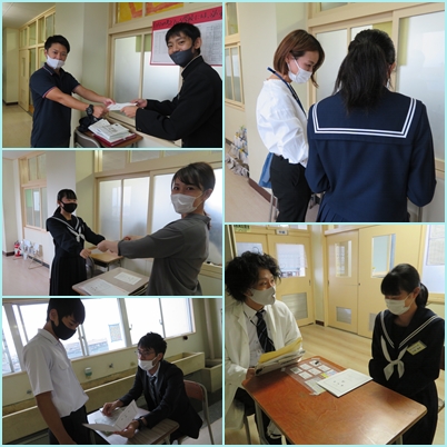 前期最後の学活では1人1人に通知表を配りました。自分の進路実現のために、前期の反省をして、後期につなげましょう。