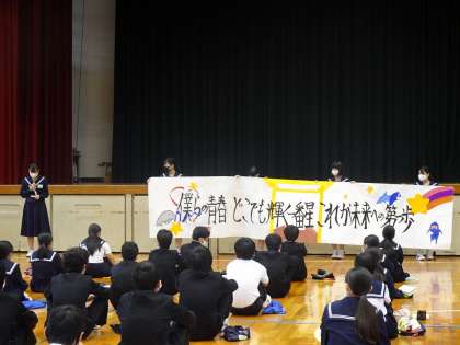 本日、令和2年度前期終業式が放送で行われました。その後、修学旅行についての学年集会が体育館で開かれ、横断幕の発表や運営部によるキャンペーンの話を聞きました。修学旅行までの残り1週間、日常生活も大切にしながら過ごしましょう。