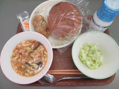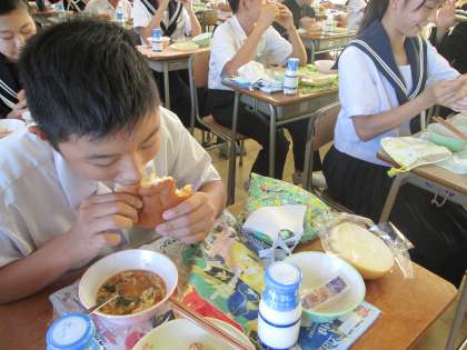 2年1組は、チキン竜田バーガー、スープともに完食でした。