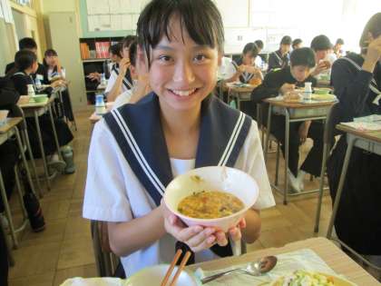今日の給食には2年1組の生徒が考えた「心も体もポカポカトマ玉スープ」が登場しました。トマトの酸味をたまごがやわらかく包んでくれた、優しい味付けのスープです。