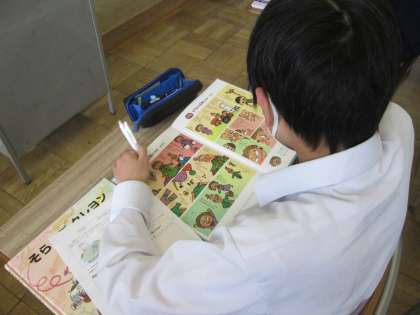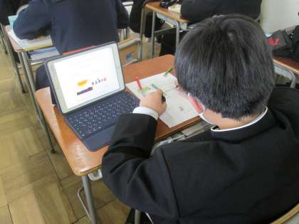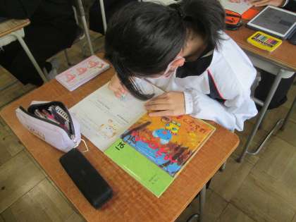 家庭科では、絵本を持ち寄って絵本の特徴をまとめていました。タブレットを使って調べている生徒もいました。みんな集中して課題に取り組むことができていました。
