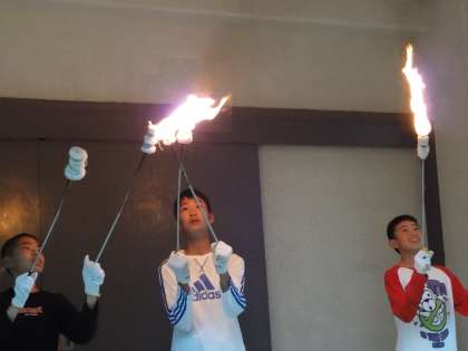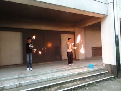 最初は怖がっていた人たちも、慣れてくると火がついていないときと同じように回すことができるようになりました。