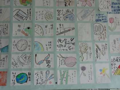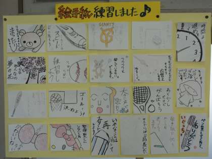 この活動に向けて、一度、絵手紙を描いてみました。現在、その作品が教室に掲示されています。傑作揃いです。