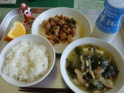 ・焼き鳥丼 ・わかめスープ ・甘夏ミカン ・ごはん ・牛乳