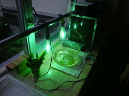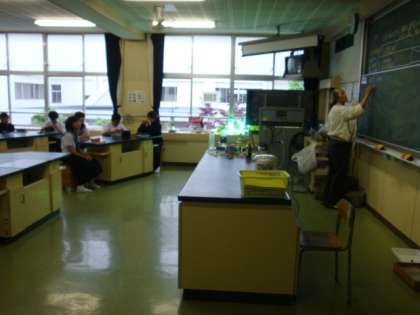 職員室前の廊下から北校舎を見ると、緑がかった強い光を放つ怪しい光源が、第2理科室の窓際に・・・。何だろうと思って理科室を覗いたところ、それは1年生の理科の学習で使う実験装置の一部でした。