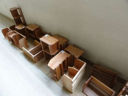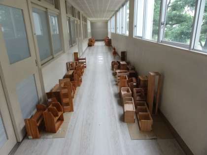 ニスを塗っていよいよ完成です。廊下で乾燥させています。家に持ち帰って使える日ももうすぐです。